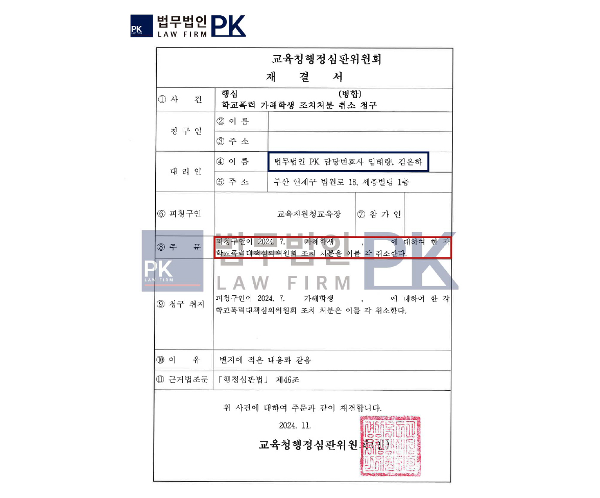 학폭위에서 가해 학생들에 대해 기존 처분보다 3~4단계 상향된 조치가 재결된 사례